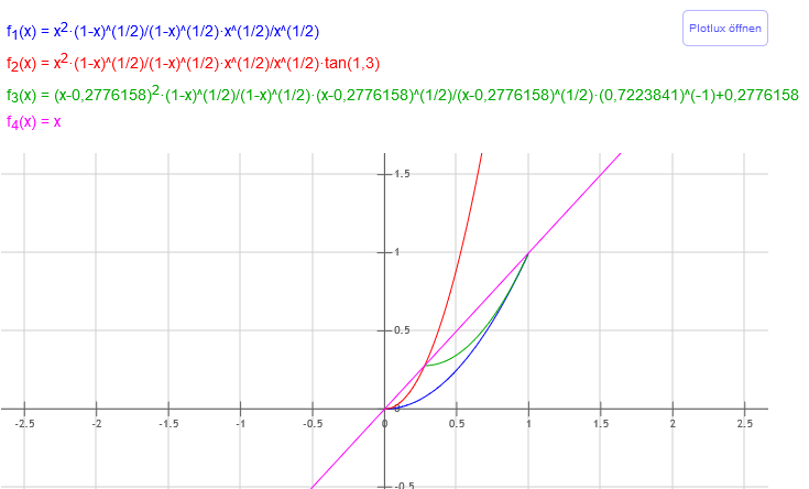 Schnittpunkte: xs1=0, xs2=0.67022346, daraus folgt: f2Vektor=x^2*tan(1.3)*tan(pi/8)*x^(1/2)/x^(1/2)*(0.67022346-x)^(1/2)/(0.67022346-x)^(1/2)